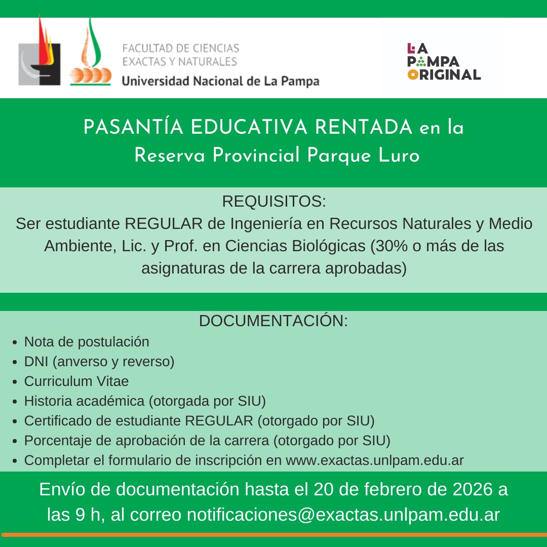 - Enviar a notificaciones@exactas.unlpam.edu.ar copia del DNI, CV, Certificado de estudiante regular, Historia académica, Declaración Jurada completa (Nota modelo en página web de la Facultad)