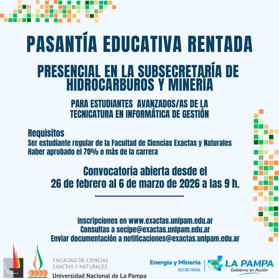 La pasantía se desarrolla en el ámbito de la Subsecretaría de Hidrocarburos y Minería del Gobierno de La Pampa, en articulación con la Facultad de Ciencias Exactas y Naturales de la UNLPam.