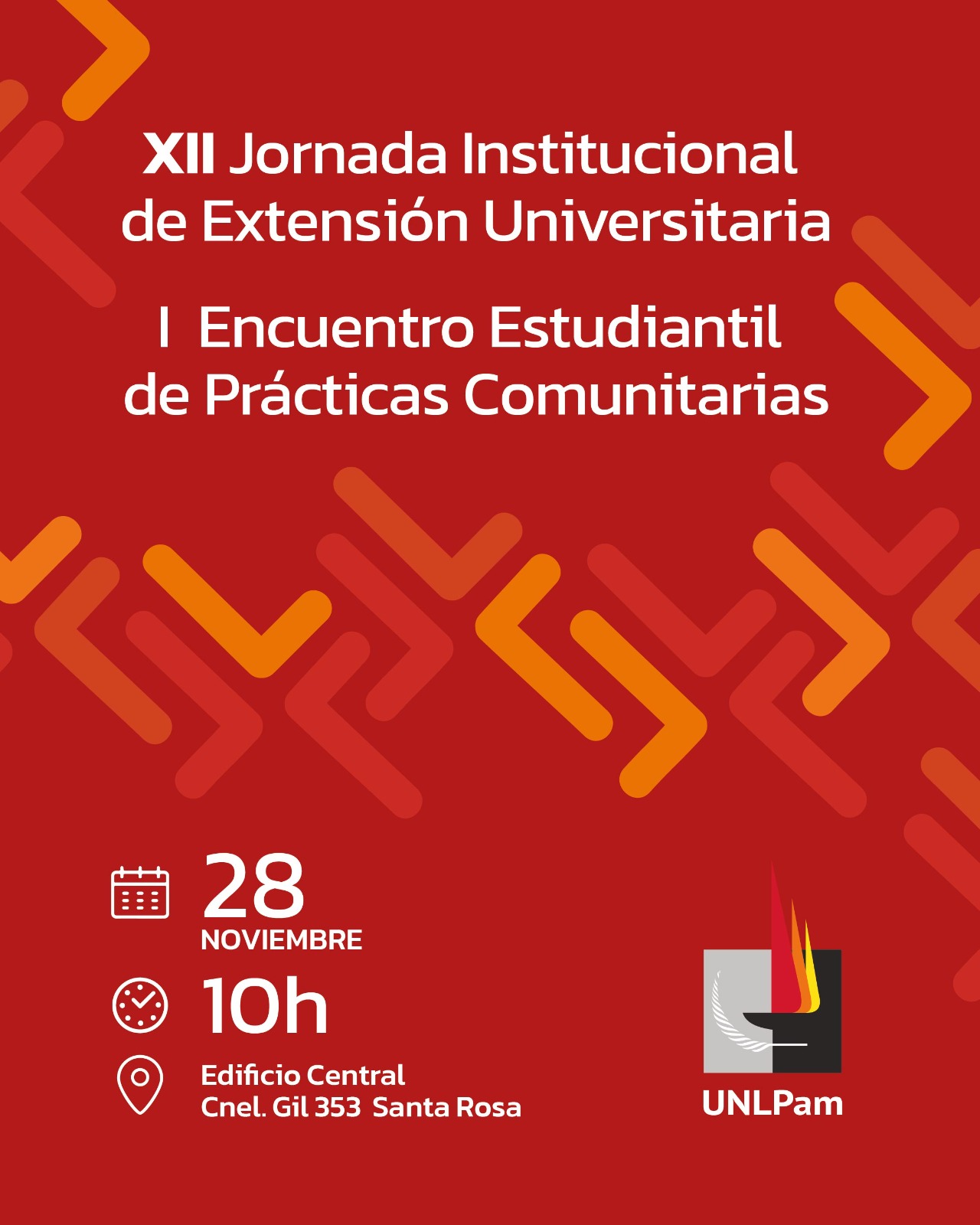 Aprobados por Res. N° 536/2024, el jueves 28 de noviembre a partir de las 10.00 se realizará en el Edificio Universitario de Gil 353 la XII Jornada de Extensión universitaria de la UNLPam y el I Encuentro Estudiantil de Prácticas Comunitarias.